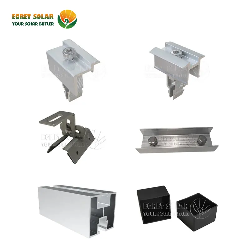 Questo tipo di sistema è costituito principalmente da un morsetto solare X, profilo in alluminio 40x40mm, morsetto di estremità rapida, connettore rapido di morsetto e binario. Per proteggere bene l'intero sistema di tetto in metallo solare regolabile, è possibile aggiungere un tappo terminale.